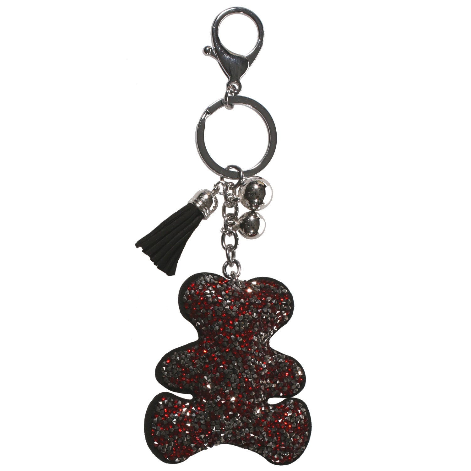 Porte-clés en métal argenté, suédine et cristaux synthétiques.