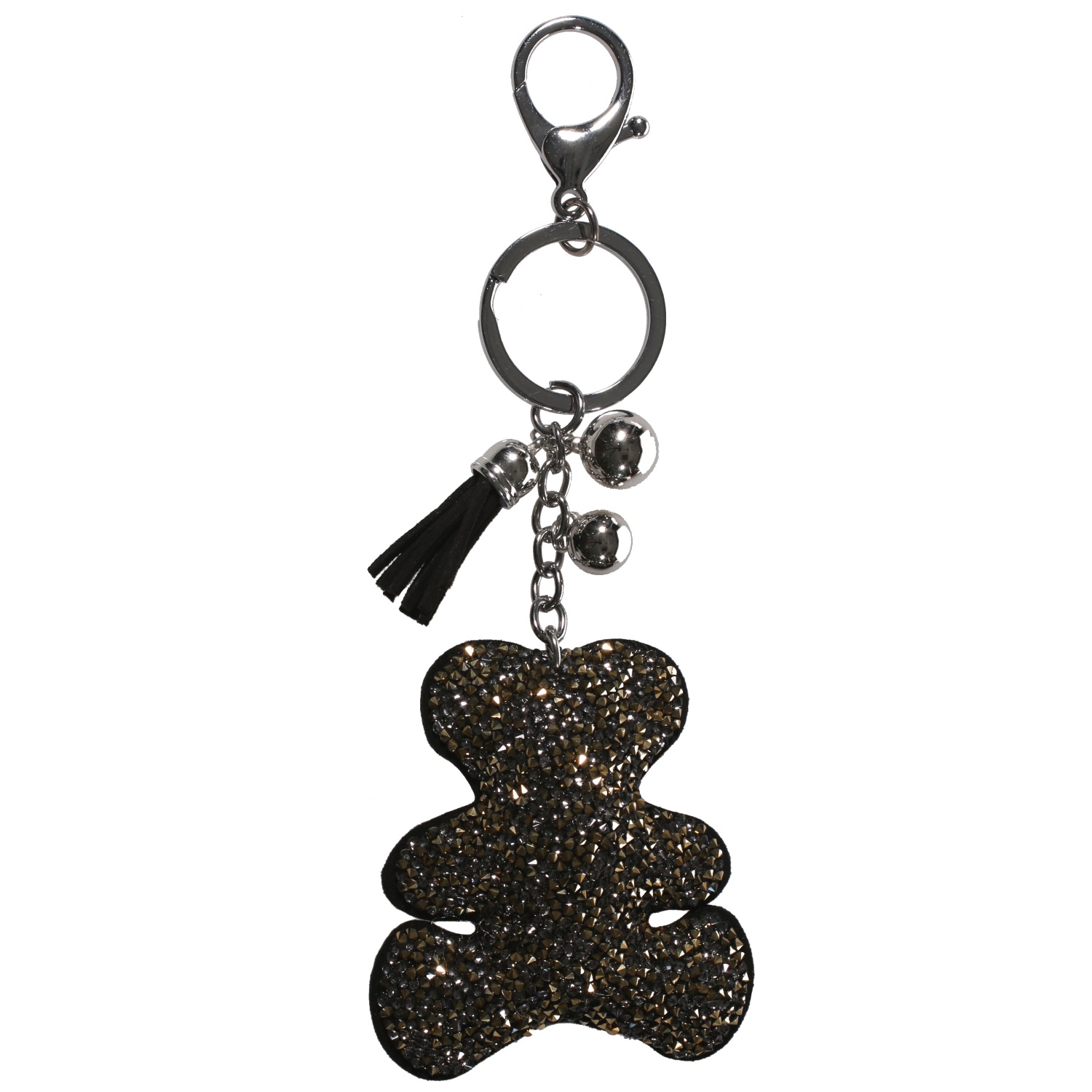 Porte-clés fantaisie en métal argenté, suédine et cristaux synthétiques.