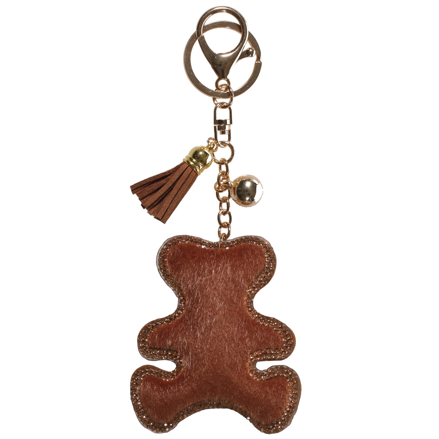 Porte-clés en métal doré, suédine, textile et cristaux synthétiques.