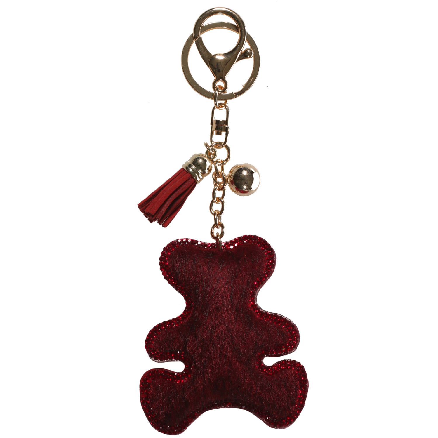 Porte-clés en métal doré, suédine, textile et cristaux synthétiques.