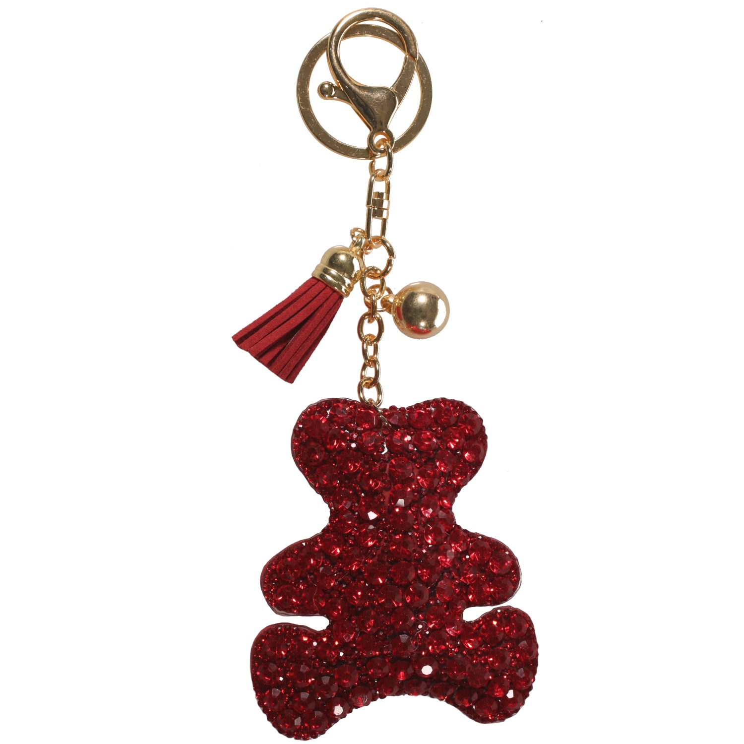 Porte-clés fantaisie en métal doré, suédine et cristaux synthétiques.
