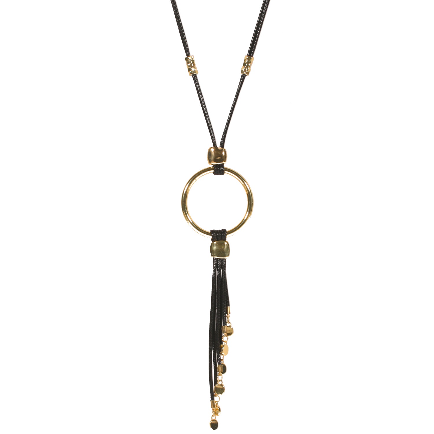 Collier sautoir fantaisie en métal doré et coton.