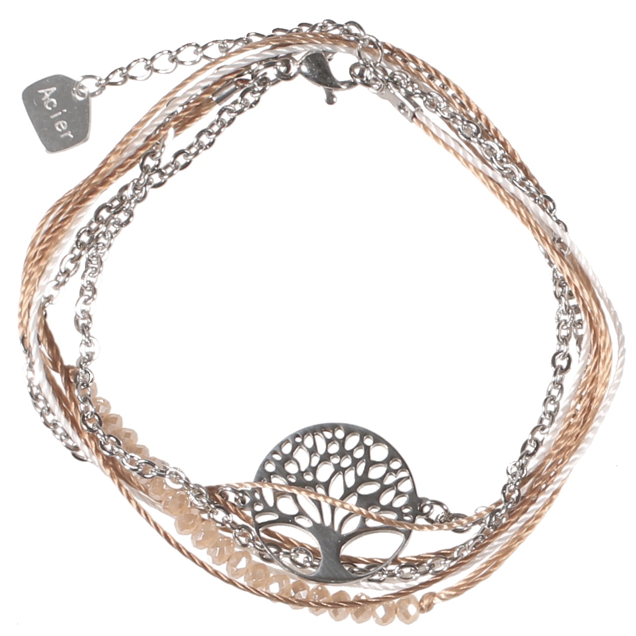 Bracelet Arbre de vie en acier, pierres synthétiques et textile.