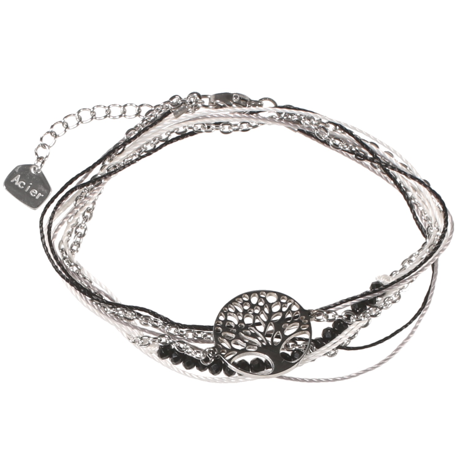 Bracelet Arbre de vie en acier, pierres synthétiques et textile.