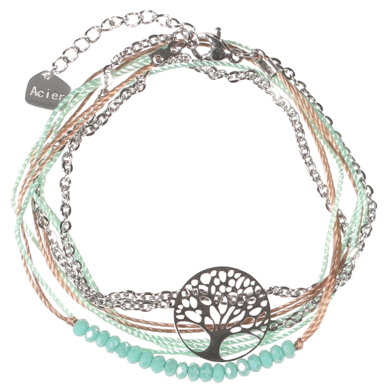 Bracelet Arbre de vie en acier, pierres synthétiques et textile.