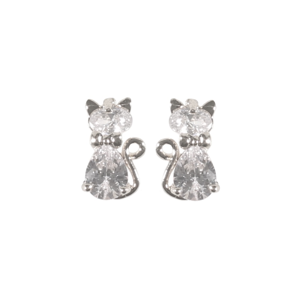 Boucles d'oreilles fantaisie Chat en métal argenté et cristaux en oxyde de zirconium.