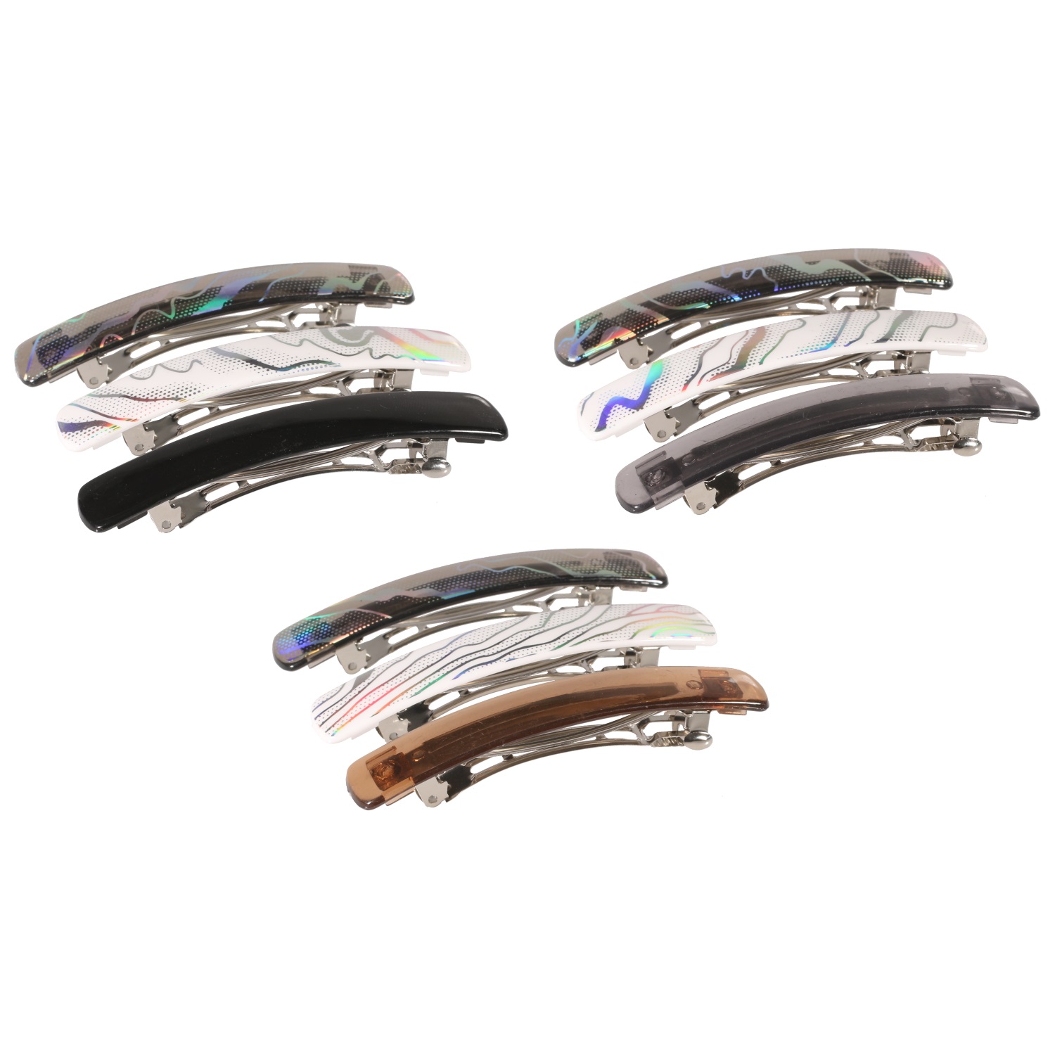 Lot de 3 barrettes pour cheveux en en métal argenté et plastique de couleur.