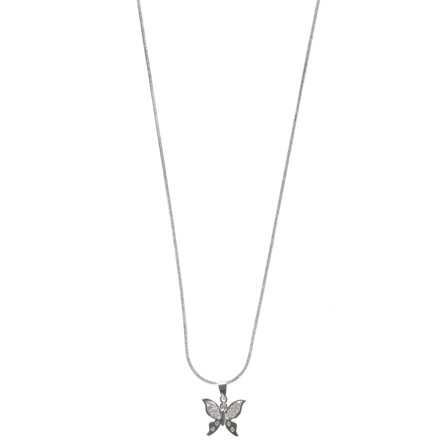 Collier fantaisie avec pendentif papillon en métal argenté plaquage supérieur et oxydes de zirconium.
