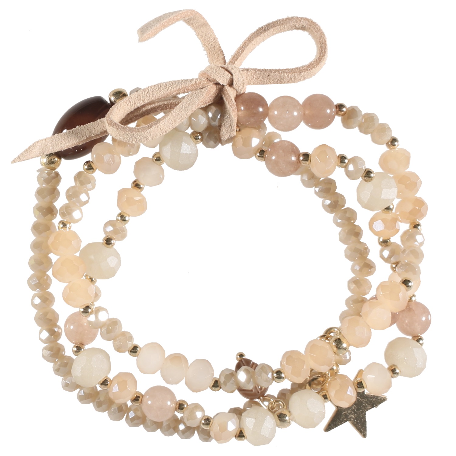 Lot de 3 bracelets fantaisie élastiques reliés par un cordon de suédine avec perles et breloques en résine, métal doré et cristaux de couleurs.