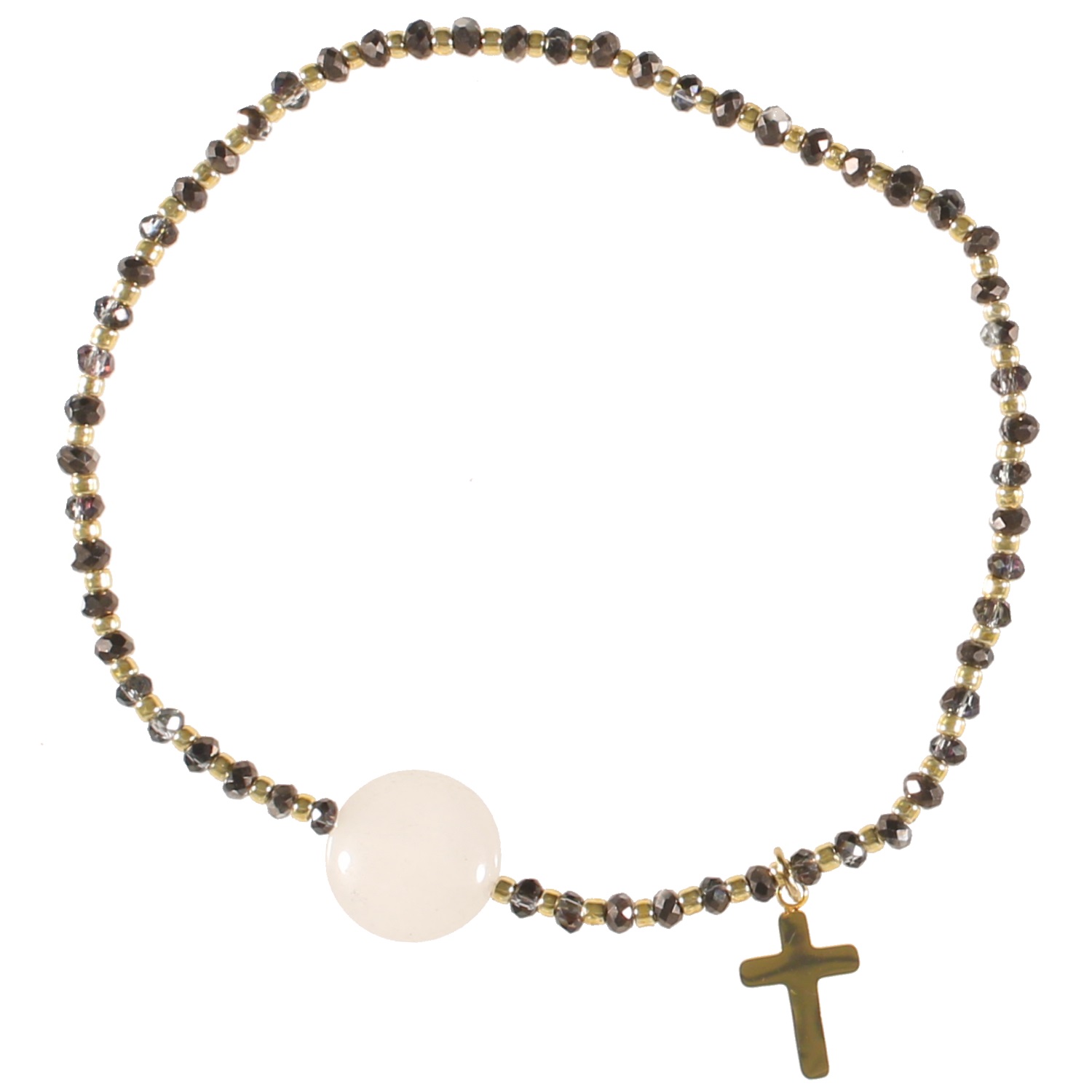 Bracelet élastique avec croix et perles en acier doré, perles de couleur et rond en pierre de couleur.