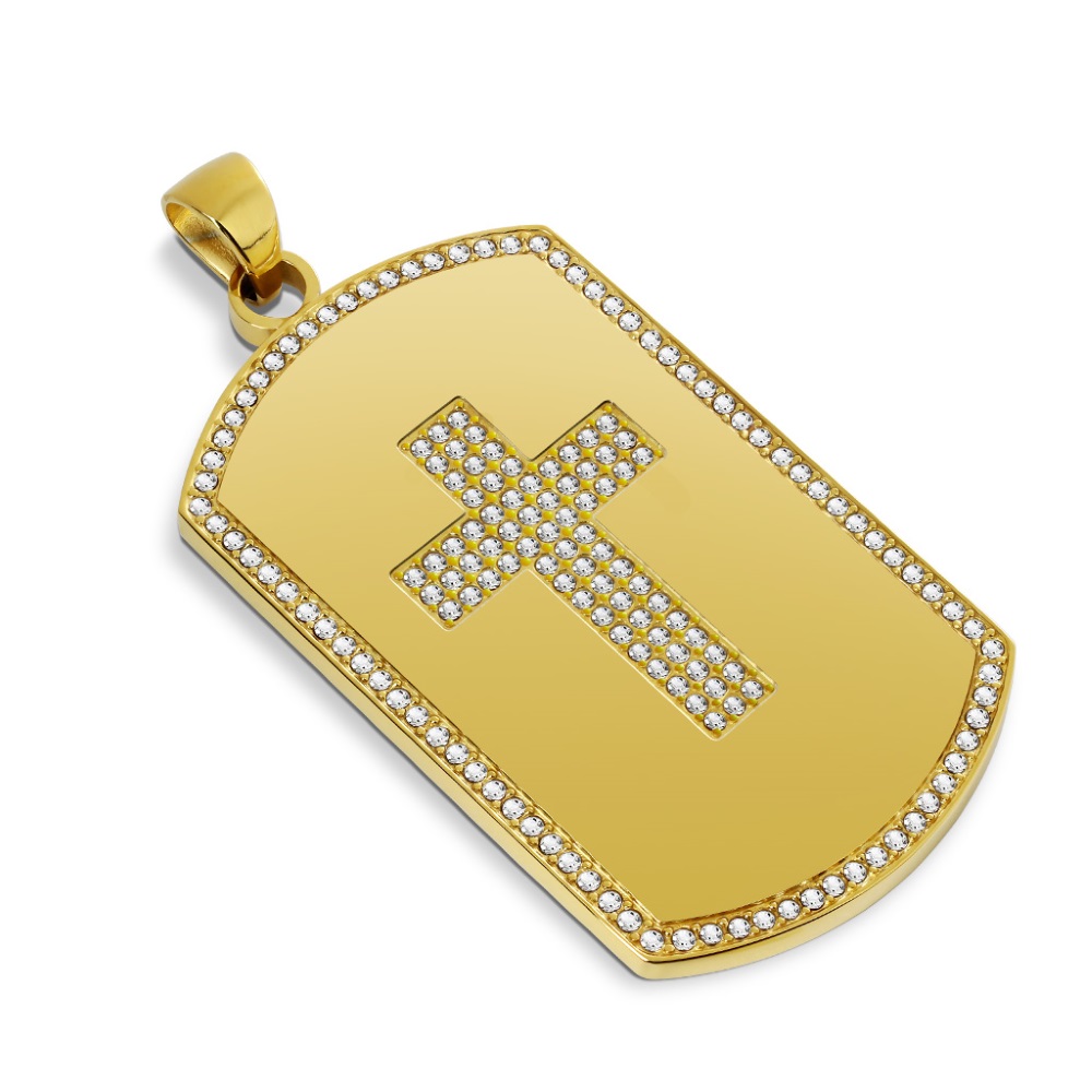 Pendentif en acier doré avec croix et bord en oxydes de zirconium.