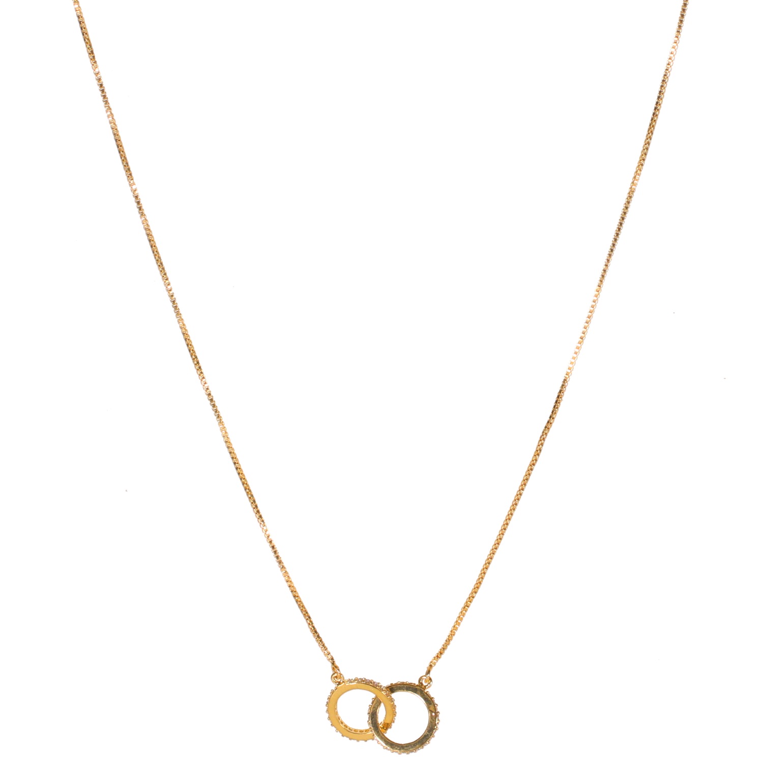Collier fantaisie avec pendentif double cercles entrelacés en métal doré et oxydes de zirconium.