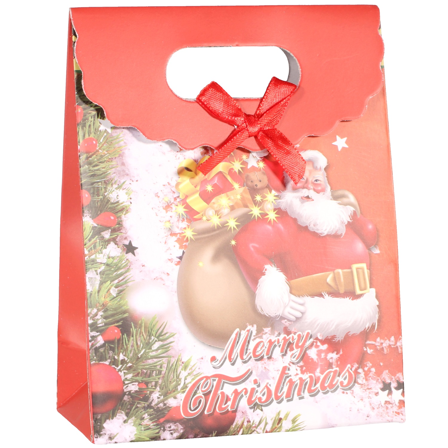 Pochette cadeau pour Noël avec le message Merry Christmas en papier cartonné et nœud papillon en textile.