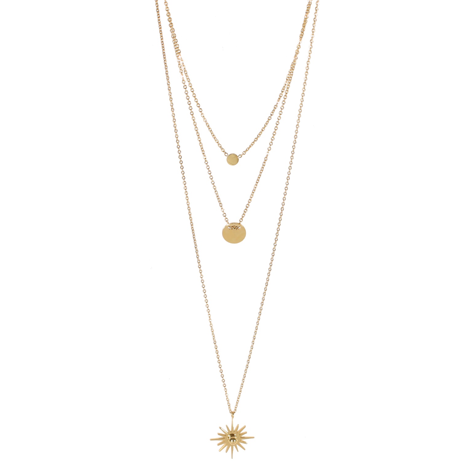 Description Collier triple rangs composé d'un collier court de 38 cm de long avec petite pastille lisse en acier doré, un collier de 42 cm de long avec pastille lisse en acier doré ainsi qu'un collier de 58 cm de long avec pendentif soleil en acier doré. L'ensemble peut se régler jusqu'à 7 cm de plus. Longueur 38/42/58+7 cm [Guide des tailles] Matière(s) Acier . L'acier utilisé dans la bijouterie existe sous plusieurs qualités. Nous utilisons principalement la qualité 316L, qualité qui est utilisée en chirurgie. Cet acier est donc inoxydable et reste très résistant. Fermoir Mousqueton À noter Pendentifs pastilles 5 mm et 10 mm de diamètre et étoile 20x20 mm Couleur(s) dominante(s) Doré Public Adolescent , Adulte . Genre Femme , Fille . Saison Indémodable . Thème(s) Nature . Collection Myriade Cliquez sur une matière, un thème, une couleur ou une collection pour voir tous les articles associés.