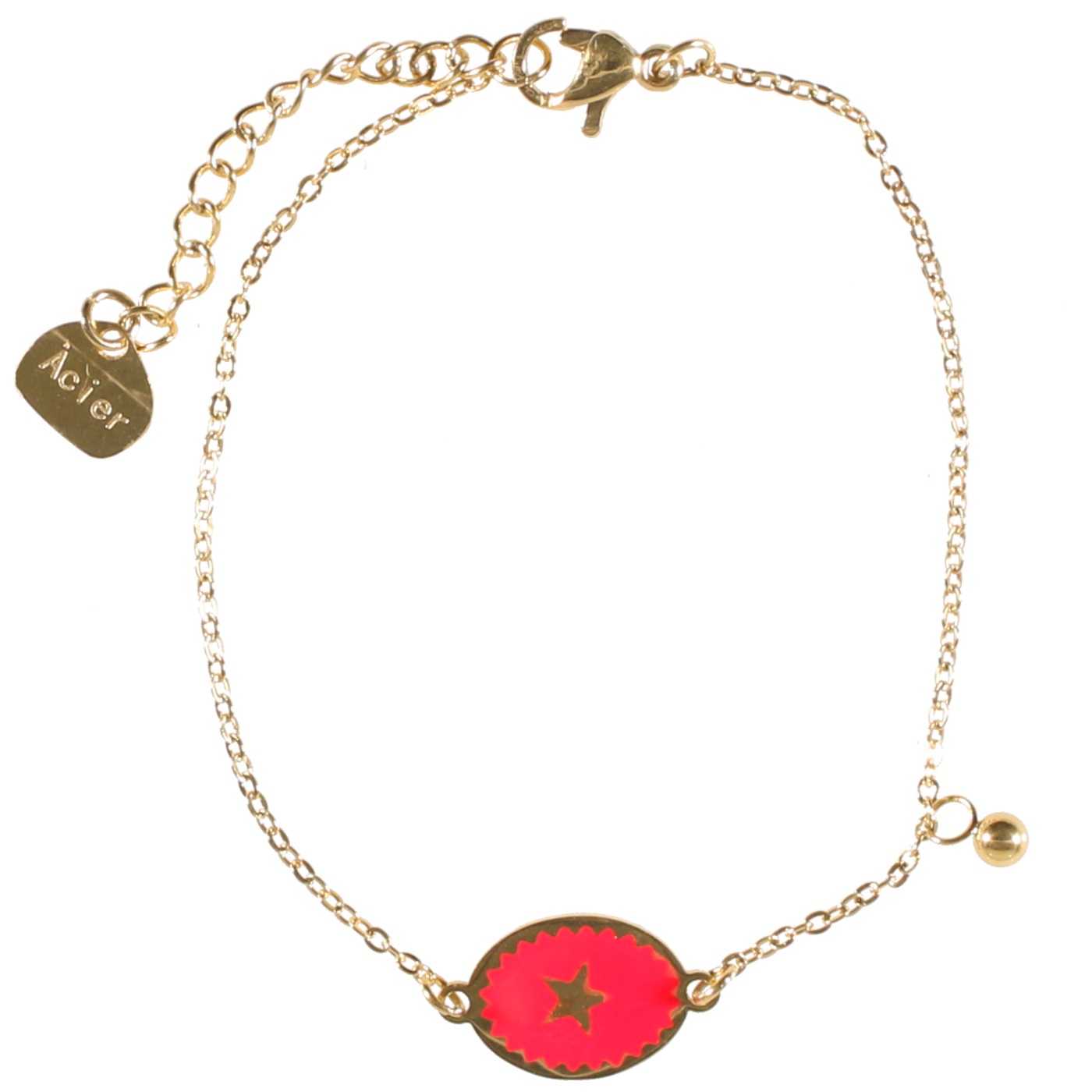 Description Bracelet avec pastille motif étoile et pampille en acier doré et émail. Cliquez sur une matière, un thème, une couleur ou une collection pour voir tous les articles associés.