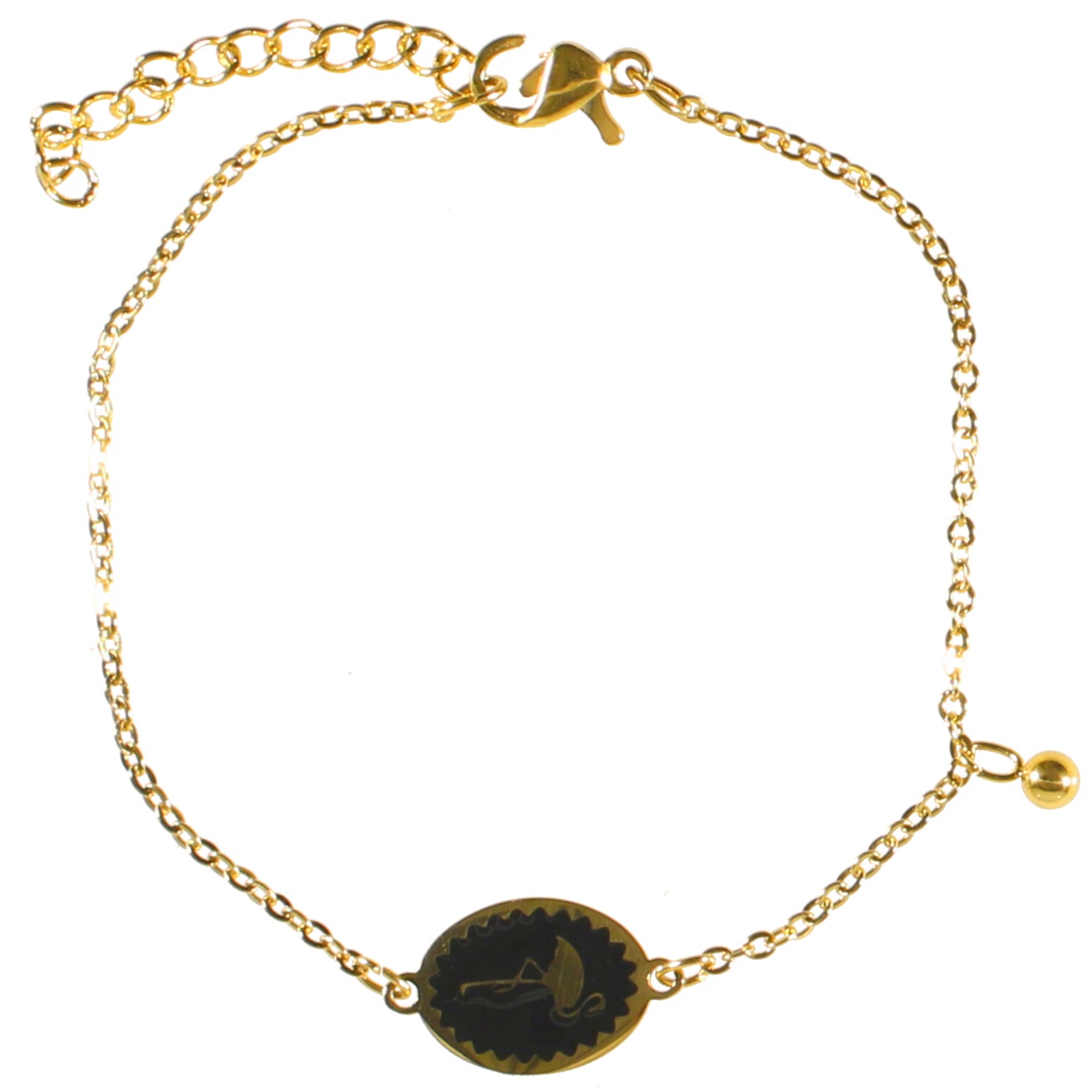 Bracelet avec pastille motif flamant et pampille en acier doré et émail.