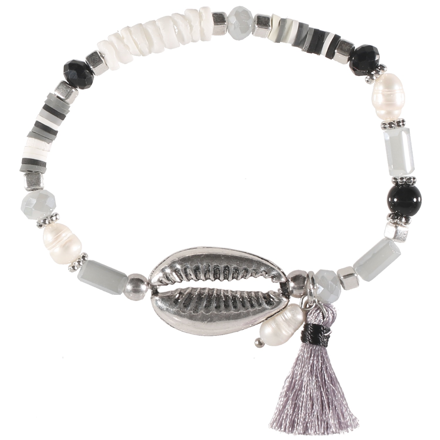 Bracelet fantaisie élastique avec coquillage cauri et perles en métal argenté, perles de couleur, rondelles de caoutchouc, perles de nacre et pompon en textile.