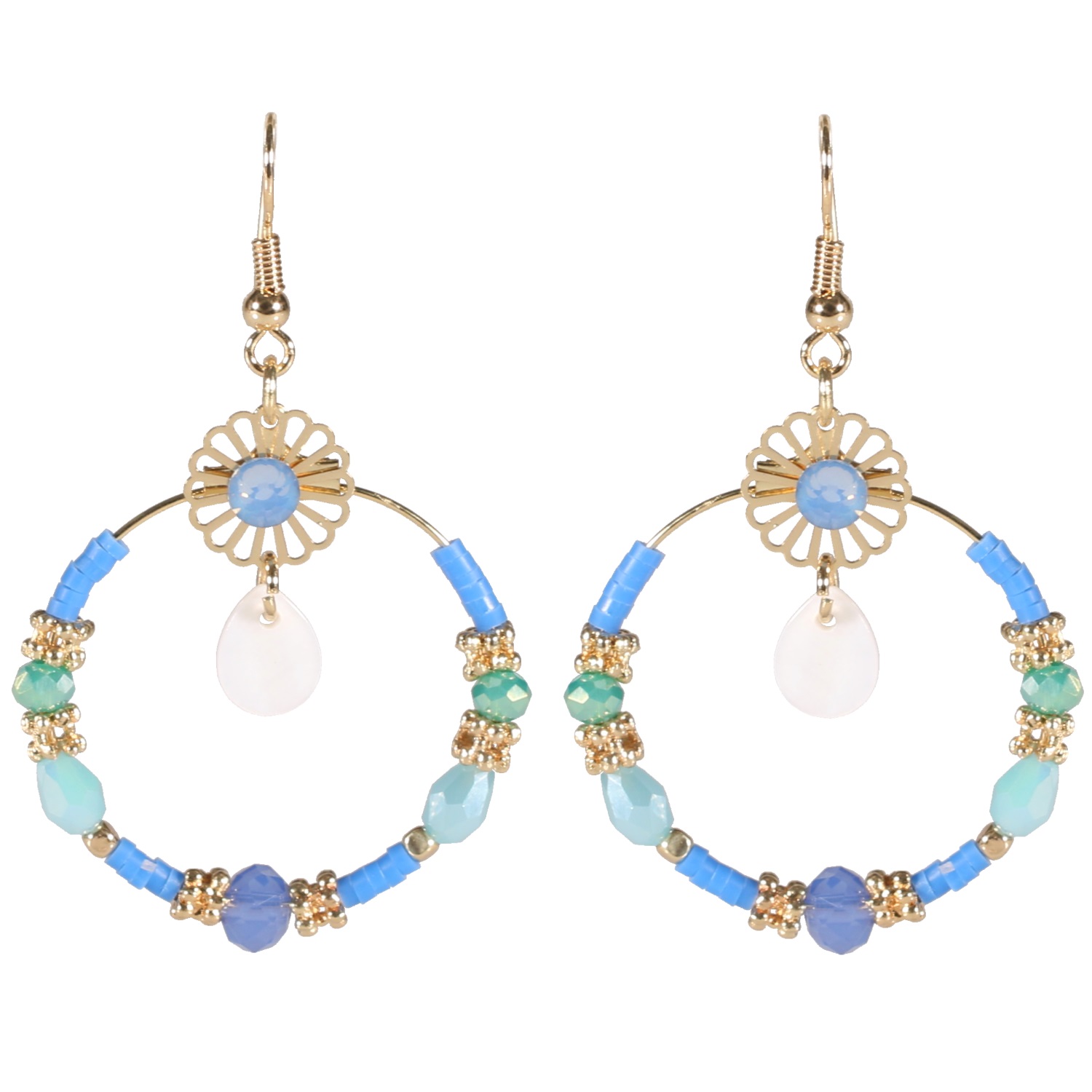 Boucles d'oreilles fantaisie pendantes cercle et fleur en métal doré, perles et cristaux de couleur et goutte en nacre.