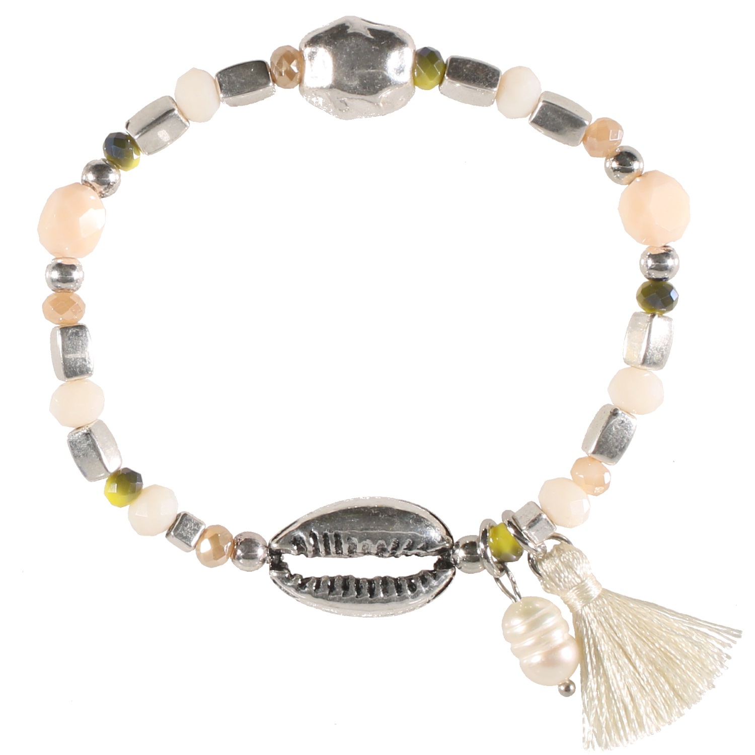 Bracelet fantaisie élastique avec breloque coquillage cauri et perles en métal argenté, perles de couleur, perle de nacre et pompon en textile.