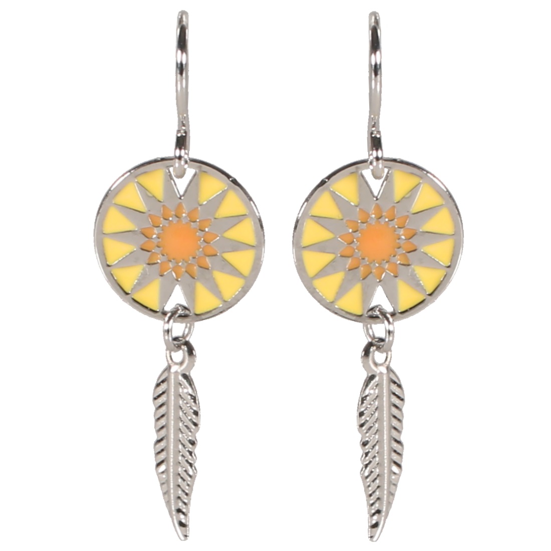 Boucles d'oreilles pendantes fantaisie motif attrape-rêve avec une plume en métal argenté et émail.