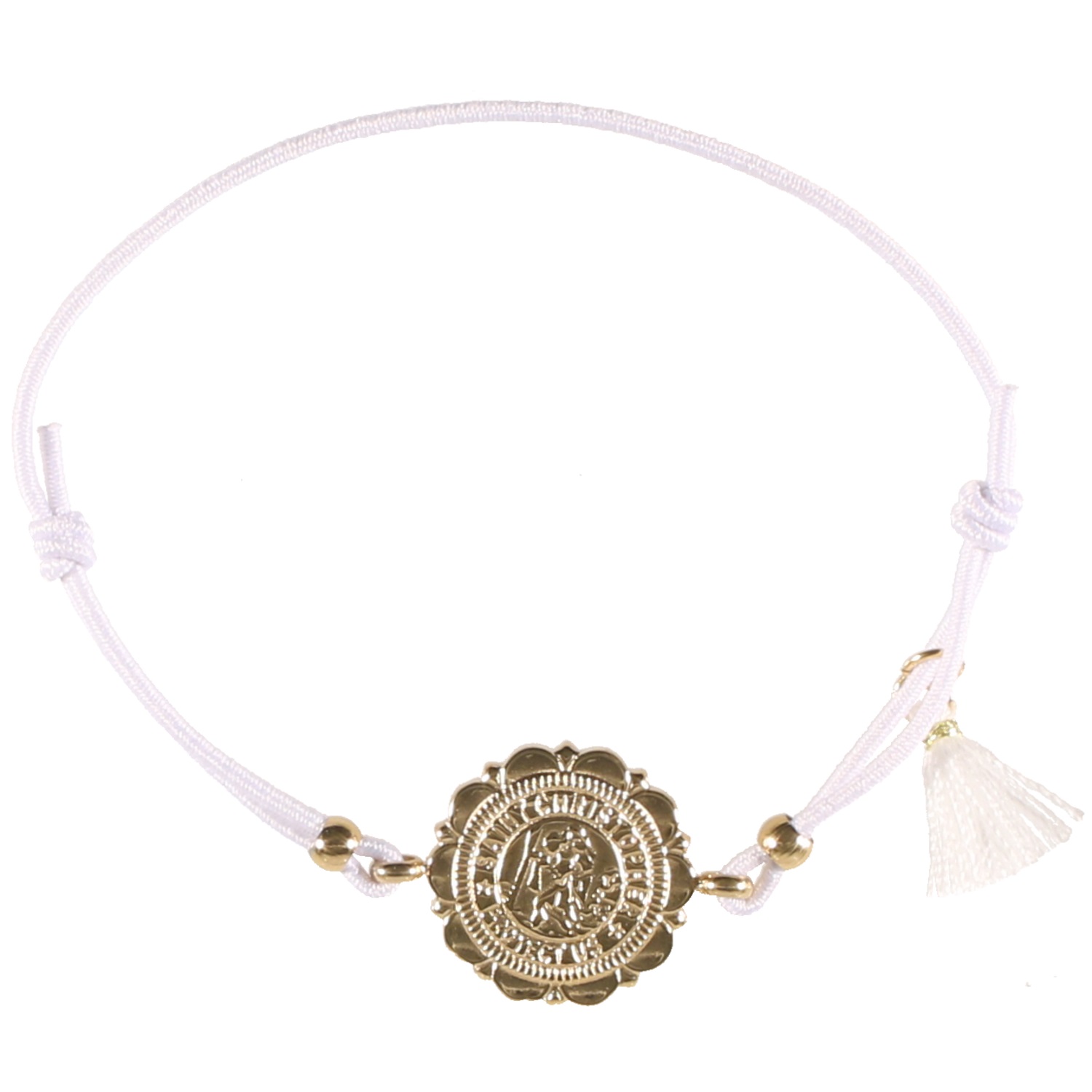Bracelet cordon élastique en coton, pompon en textile et médaillon de Saint Christophe en acier doré.