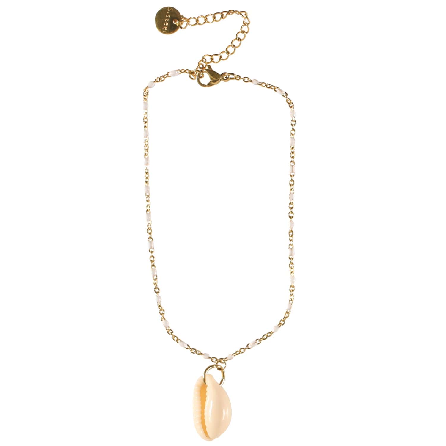Bracelet chaîne de cheville en acier doré, perles en émail et véritable coquillage cauri.
