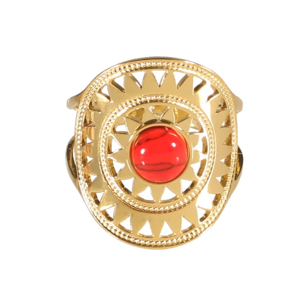 Description Bague motif soleil en acier doré et pierre de couleur rouge. Taille ajustable. Largeur 20 mm Matière(s) Acier , Rocaille . L'acier utilisé dans la bijouterie existe sous plusieurs qualités. Nous utilisons principalement la qualité 316L, qualité qui est utilisée en chirurgie. Cet acier est donc inoxydable et reste très résistant. À noter Taille ajustable Couleur(s) dominante(s) Doré , Rouge Public Adolescent , Adulte . Genre Femme , Fille . Saison Indémodable . Thème(s) Nature . Collection Royale inca Cliquez sur une matière, un thème, une couleur ou une collection pour voir tous les articles associés.