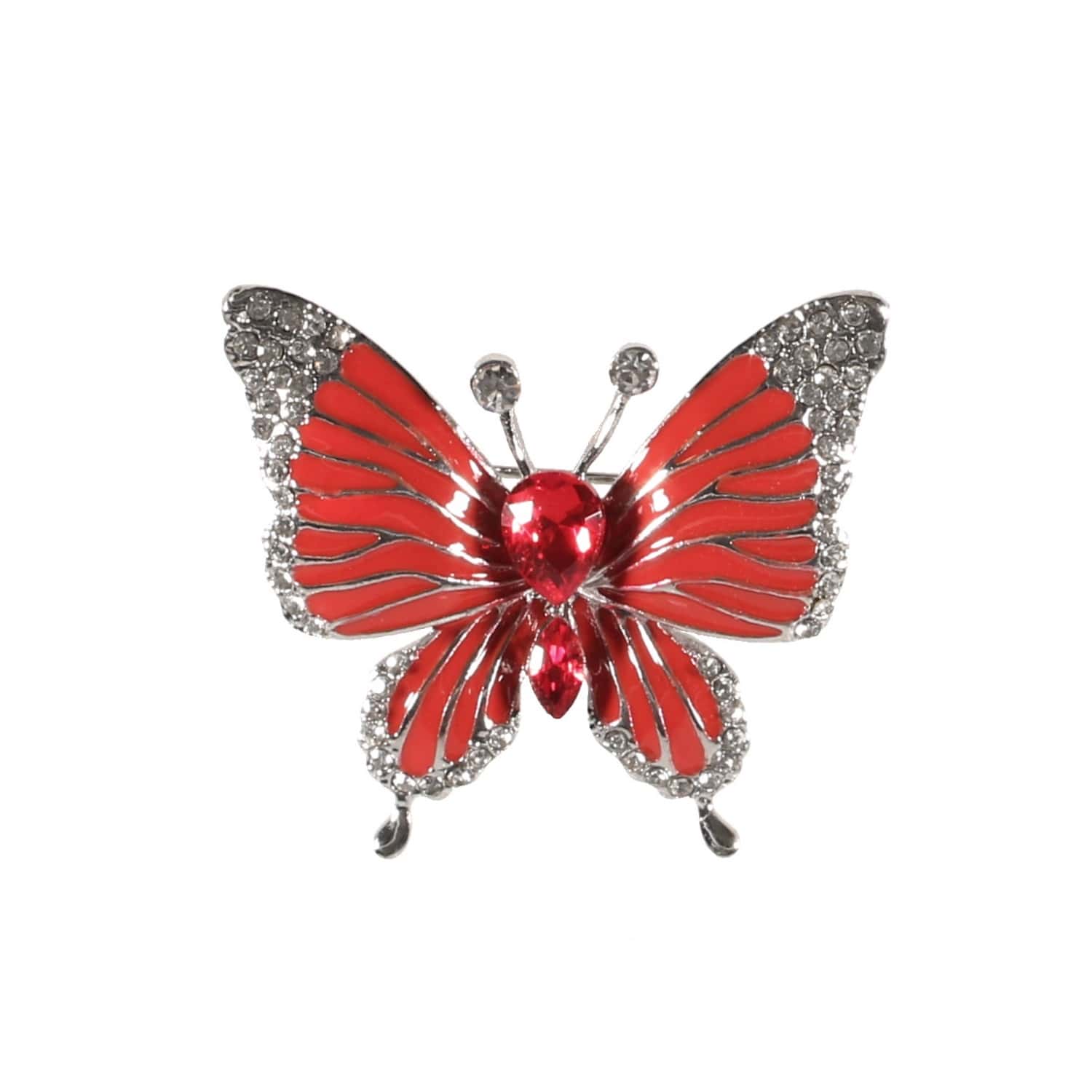 Broche fantaisie papillon en métal argenté, émail de couleur rouge, cristaux de couleur rouge et strass en verre.