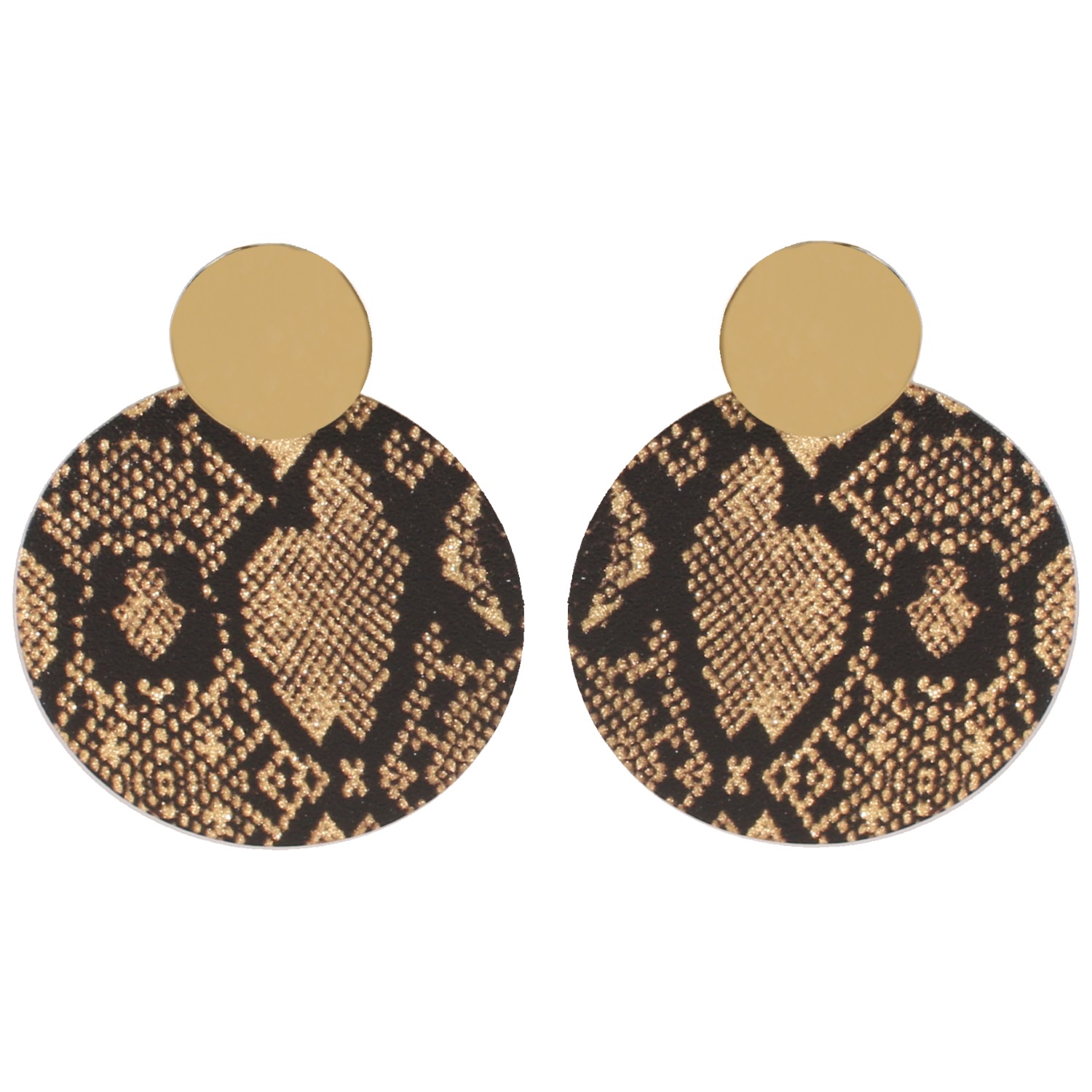 Boucles d'oreilles pendantes composées d'une pastille ronde lisse en acier doré et une pastille ronde recouverte de motifs en émail.