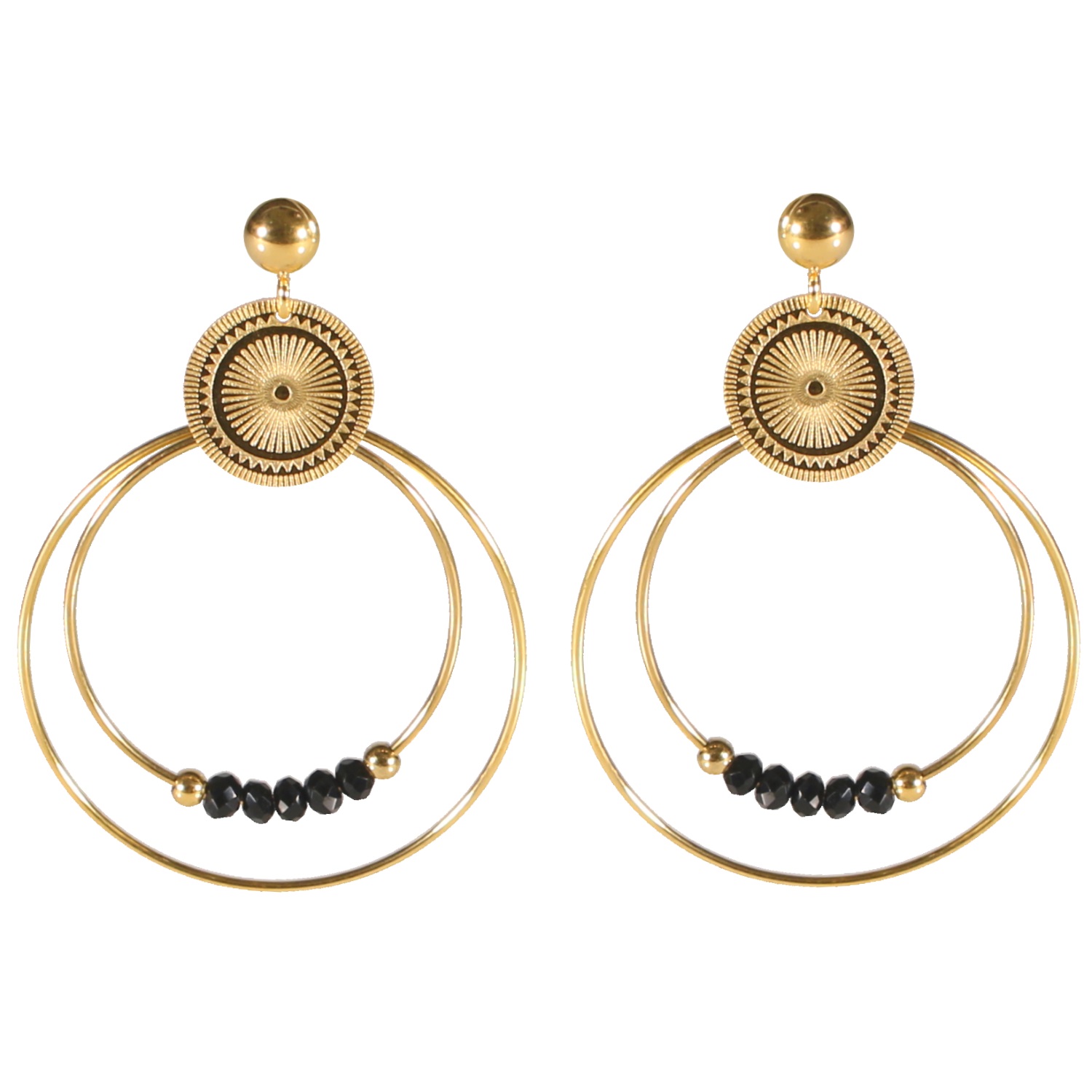 Description Boucles d'oreilles pendantes composées de médaillons et double cercles en acier doré et perles de couleur noire. Largeur 32 mm Hauteur 45 mm Matière(s) Acier , Rocaille . L'acier utilisé dans la bijouterie existe sous plusieurs qualités. Nous utilisons principalement la qualité 316L, qualité qui est utilisée en chirurgie. Cet acier est donc inoxydable et reste très résistant. Fermoir Tiges poussettes Couleur(s) dominante(s) Doré , Noir Public Adolescent , Adulte . Genre Femme , Fille . Saison Indémodable . Cliquez sur une matière, un thème, une couleur ou une collection pour voir tous les articles associés.