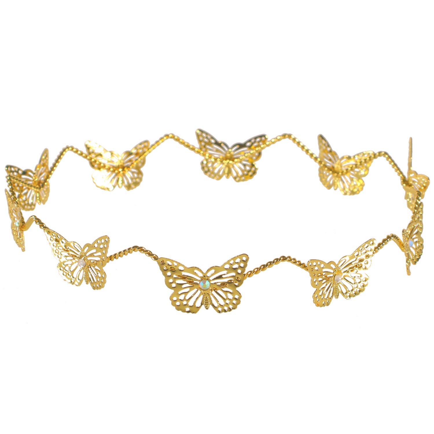 Serre-tête fermé avec papillons ajourés en métal doré et strass.