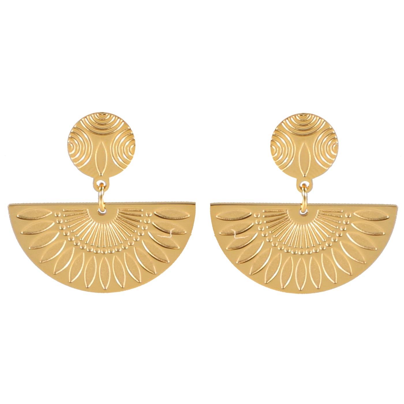 Description Boucles d'oreilles pendantes composées de puces rondes et de demi pastilles rondes aux motifs gravés en acier doré. Largeur 22 mm Hauteur 22 mm Matière(s) Acier . L'acier utilisé dans la bijouterie existe sous plusieurs qualités. Nous utilisons principalement la qualité 316L, qualité qui est utilisée en chirurgie. Cet acier est donc inoxydable et reste très résistant. Fermoir Tiges poussettes Couleur(s) dominante(s) Doré Public Adolescent , Adulte . Genre Femme , Fille . Saison Indémodable . Collection Royale inca Cliquez sur une matière, un thème, une couleur ou une collection pour voir tous les articles associés.