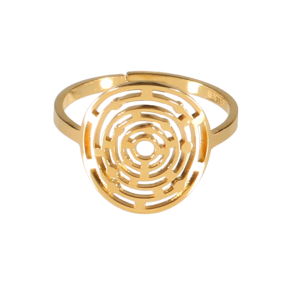 Description Bague motif de labyrinthe ajouré en acier doré. Taille ajustable. Largeur 14 mm Matière(s) Acier . L'acier utilisé dans la bijouterie existe sous plusieurs qualités. Nous utilisons principalement la qualité 316L, qualité qui est utilisée en chirurgie. Cet acier est donc inoxydable et reste très résistant. Couleur(s) dominante(s) Doré Public Adolescent , Adulte . Genre Femme , Fille . Saison Indémodable . Cliquez sur une matière, un thème, une couleur ou une collection pour voir tous les articles associés.