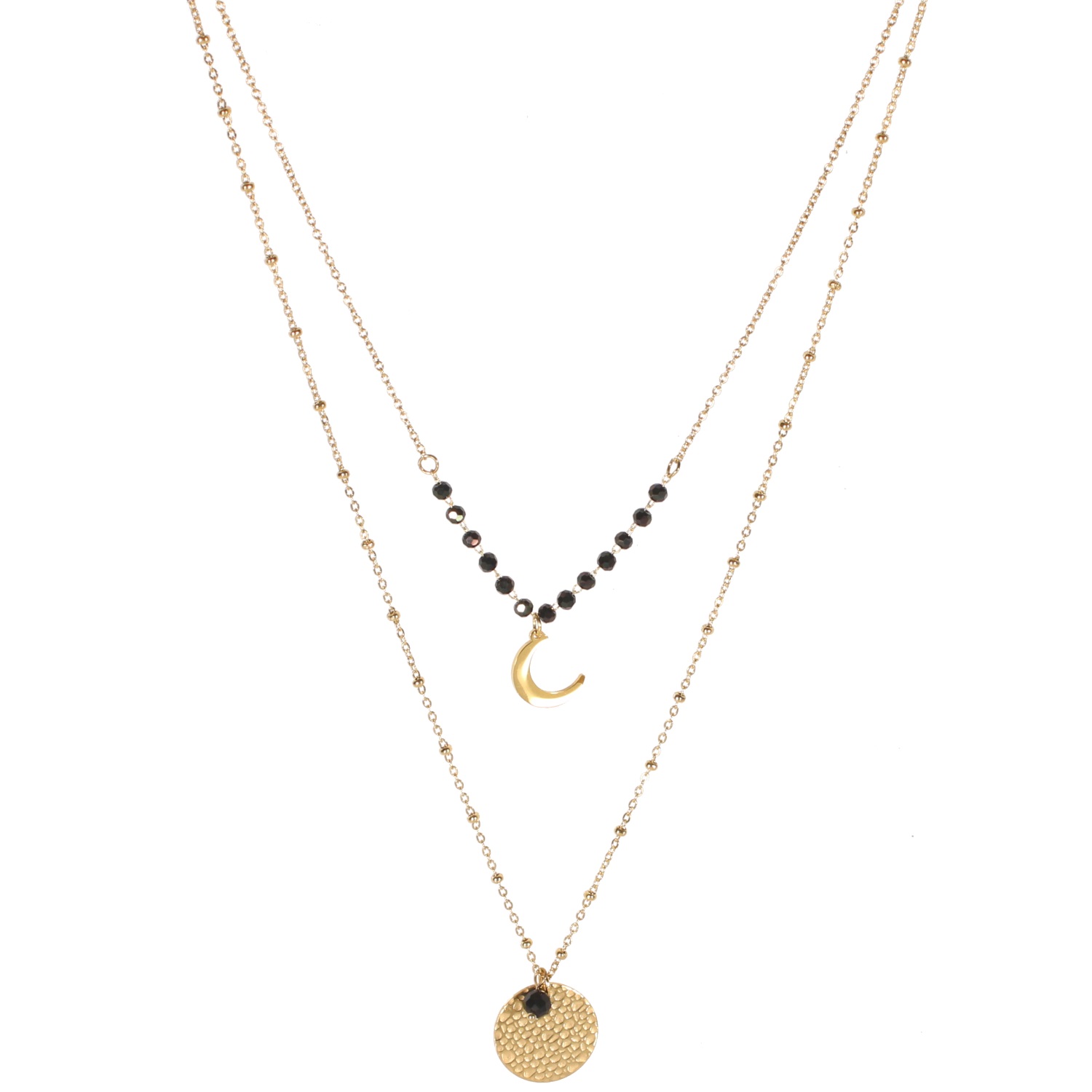 Collier double rangs composé d'un collier chaîne de 41 cm de long avec pendentif croissant de lune en acier doré et perles de couleur noire, ainsi qu'un collier chaîne de 50 cm de long avec pendentif rond martelé en acier doré et une perle pendante de couleur noire.