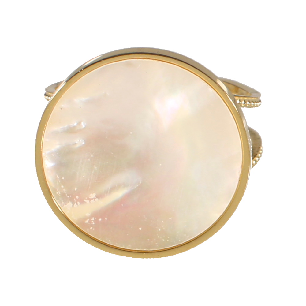 Description Bague double rangs en métal doré surmontée d'une pastille ronde sertie de nacre. Taille ajustable. Cliquez sur une matière, un thème, une couleur ou une collection pour voir tous les articles associés.