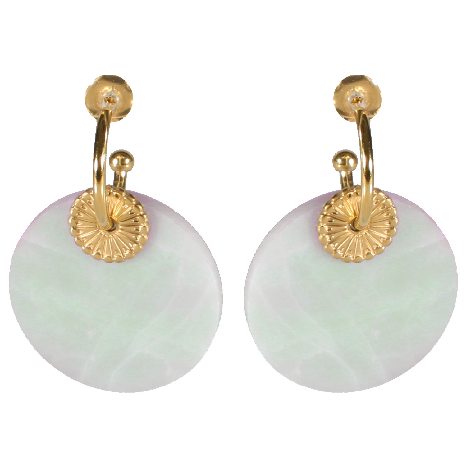 Boucles d'oreilles créoles ouvertes avec pastilles rondes aux motifs et contours en relief en acier doré et une pastille ronde en véritable pierre d'amazonite.