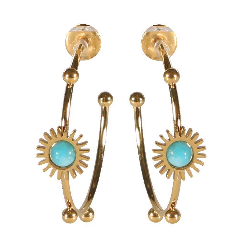 Boucles d'oreilles créoles ouvertes en acier doré surmontées d'une véritable pierre d'amazonite posée sur un soleil.