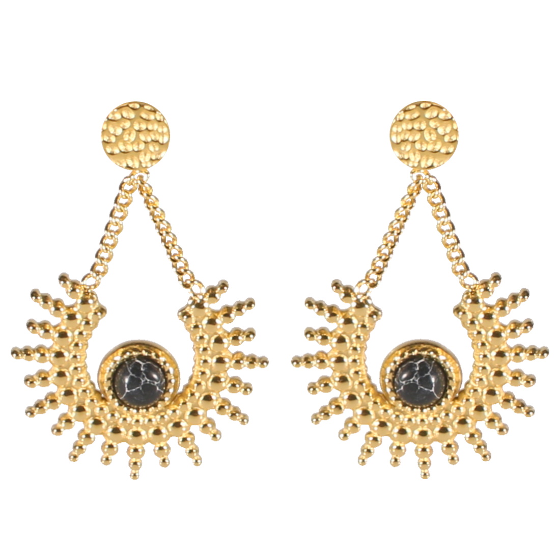 Description Boucles d'oreilles pendantes composées d'une puce ronde martelée et d'un soleil suspendu par une chaîne en acier doré surmonté d'une pierre de couleur noire. Largeur 20 mm Hauteur 30 mm Matière(s) Acier , Rocaille . L'acier utilisé dans la bijouterie existe sous plusieurs qualités. Nous utilisons principalement la qualité 316L, qualité qui est utilisée en chirurgie. Cet acier est donc inoxydable et reste très résistant. Fermoir Tiges poussettes Couleur(s) dominante(s) Doré , Noir Public Adolescent , Adulte . Genre Femme , Fille . Saison Indémodable . Thème(s) Nature . Collection My Sun Cliquez sur une matière, un thème, une couleur ou une collection pour voir tous les articles associés.