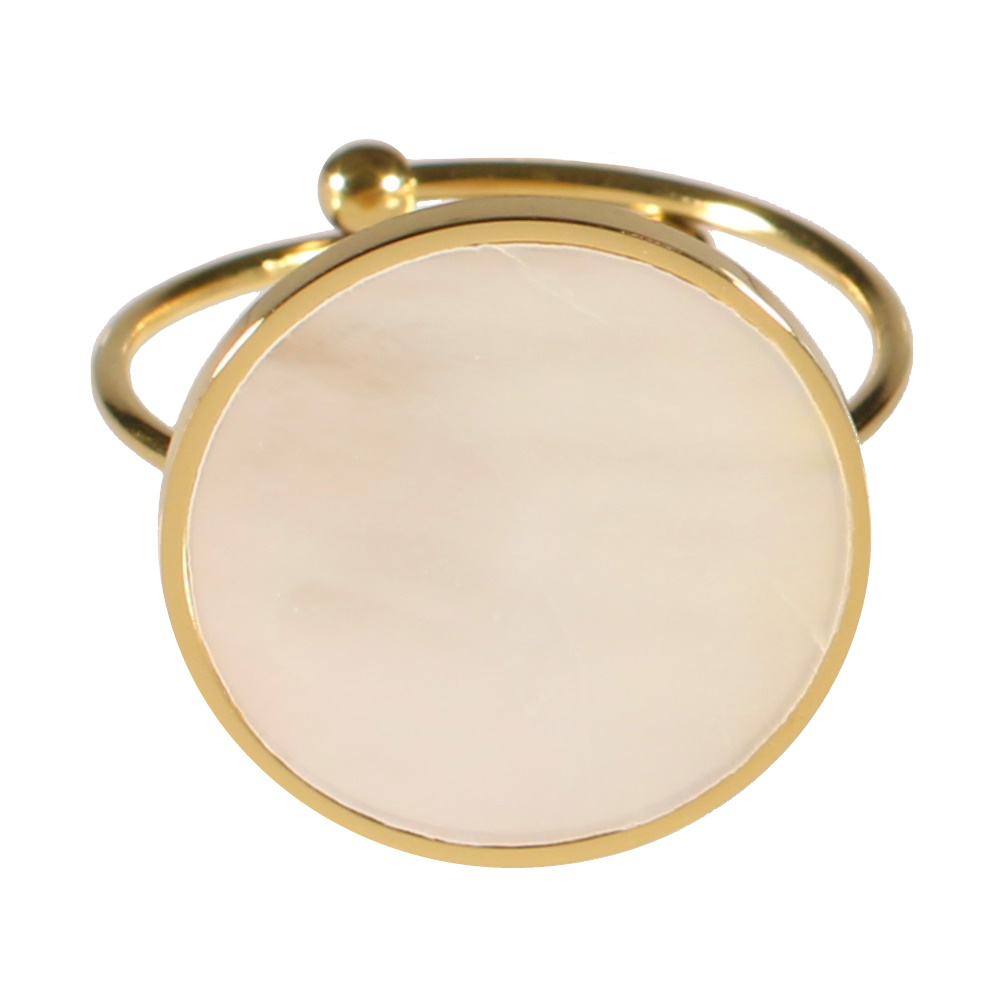 Description Bague en acier doré surmontée d'un pavage rond de nacre. Taille ajustable. Cliquez sur une matière, un thème, une couleur ou une collection pour voir tous les articles associés.