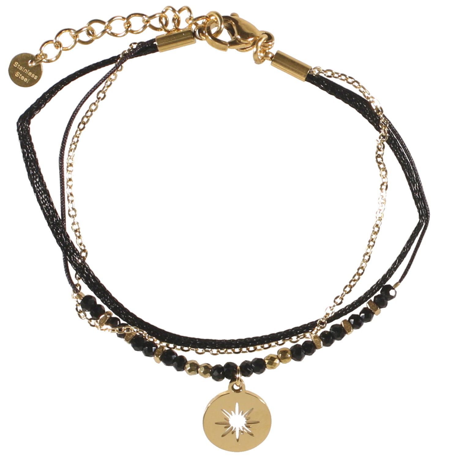 Bracelet triple rangs composé d'un cordon en textile, une chaîne en acier doré et un cordon en coton avec perles de couleur noire et un pendant rond au motif ajouré d'étoile en acier doré.