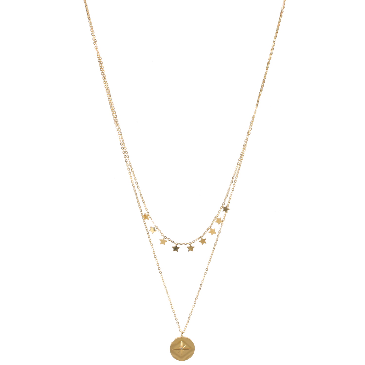Description Collier double rangs composé d'une chaîne de 40 cm de long avec pampilles étoiles en acier doré, ainsi qu'une chaîne de 46 cm de long en acier doré et un pendentif pastille ronde avec motif d'étoile en acier doré sertie d'un cristal au centre de l'étoile. Fermoir mousqueton avec 6 cm de rallonge. Cliquez sur une matière, un thème, une couleur ou une collection pour voir tous les articles associés.