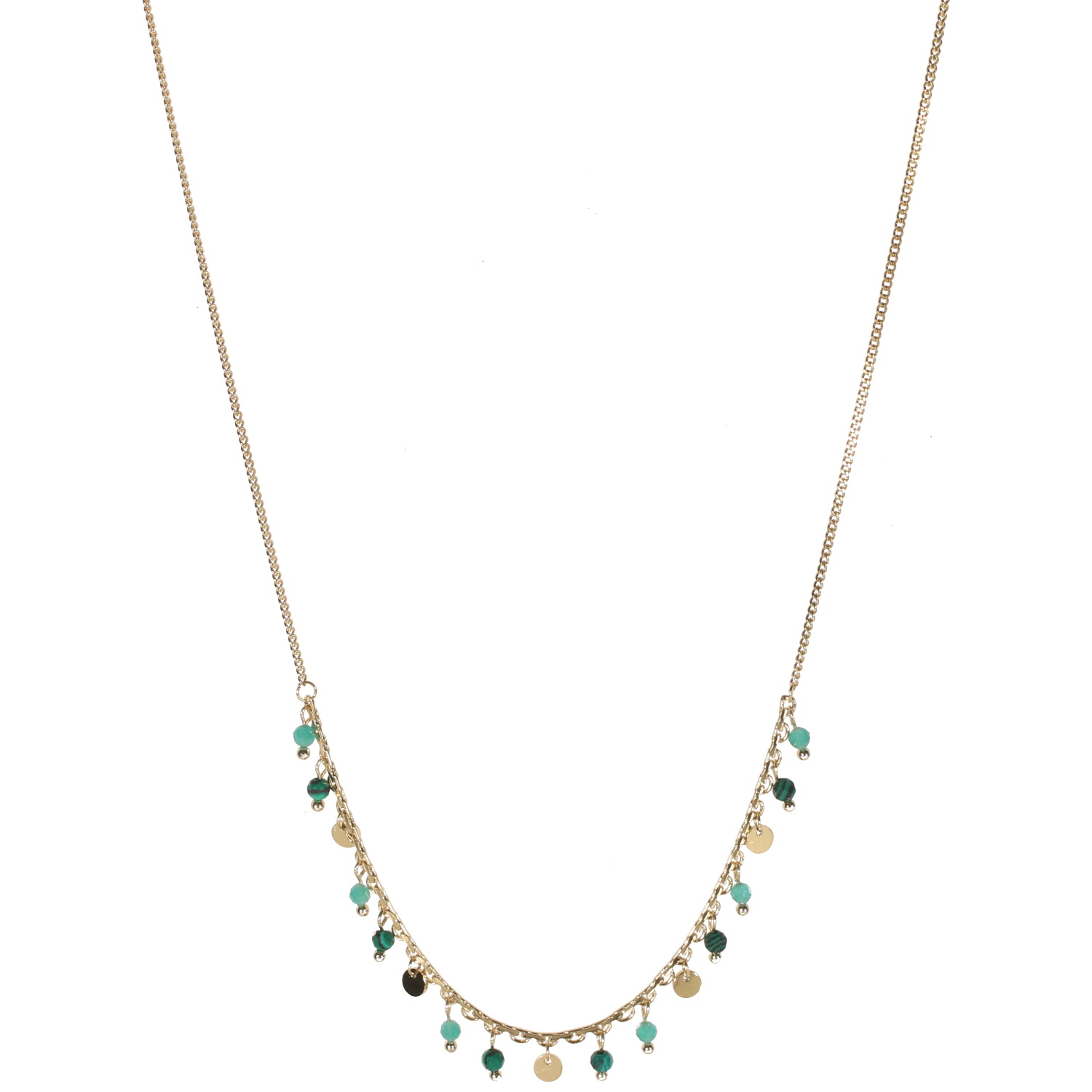 Collier composé d'une chaîne et pampilles rondes en acier doré et perles en pierre naturelle de malachite.