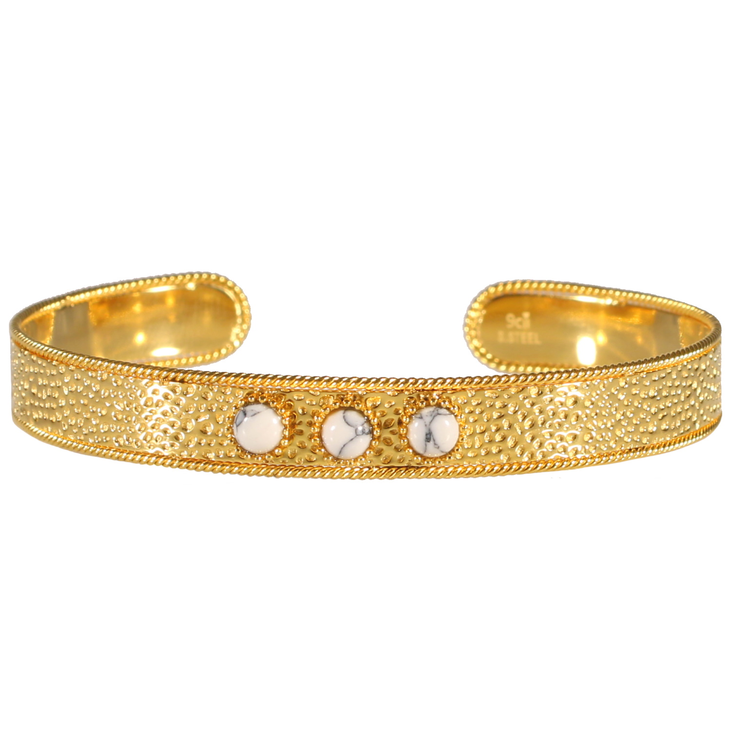 Description Bracelet jonc ouvert et rigide aux motifs martelés en acier 316L doré surmonté de trois pierres de couleur blanche serties clos de forme ronde. Largeur 8 mm Diamètre 60 mm [Guide des tailles] Matière(s) Acier , Rocaille . L'acier utilisé dans la bijouterie existe sous plusieurs qualités. Nous utilisons principalement la qualité 316L, qualité qui est utilisée en chirurgie. Cet acier est donc inoxydable et reste très résistant. Fermoir Aucun Couleur(s) dominante(s) Blanc , Doré Public Adolescent , Adulte . Genre Femme , Fille . Saison Indémodable . Cliquez sur une matière, un thème, une couleur ou une collection pour voir tous les articles associés.