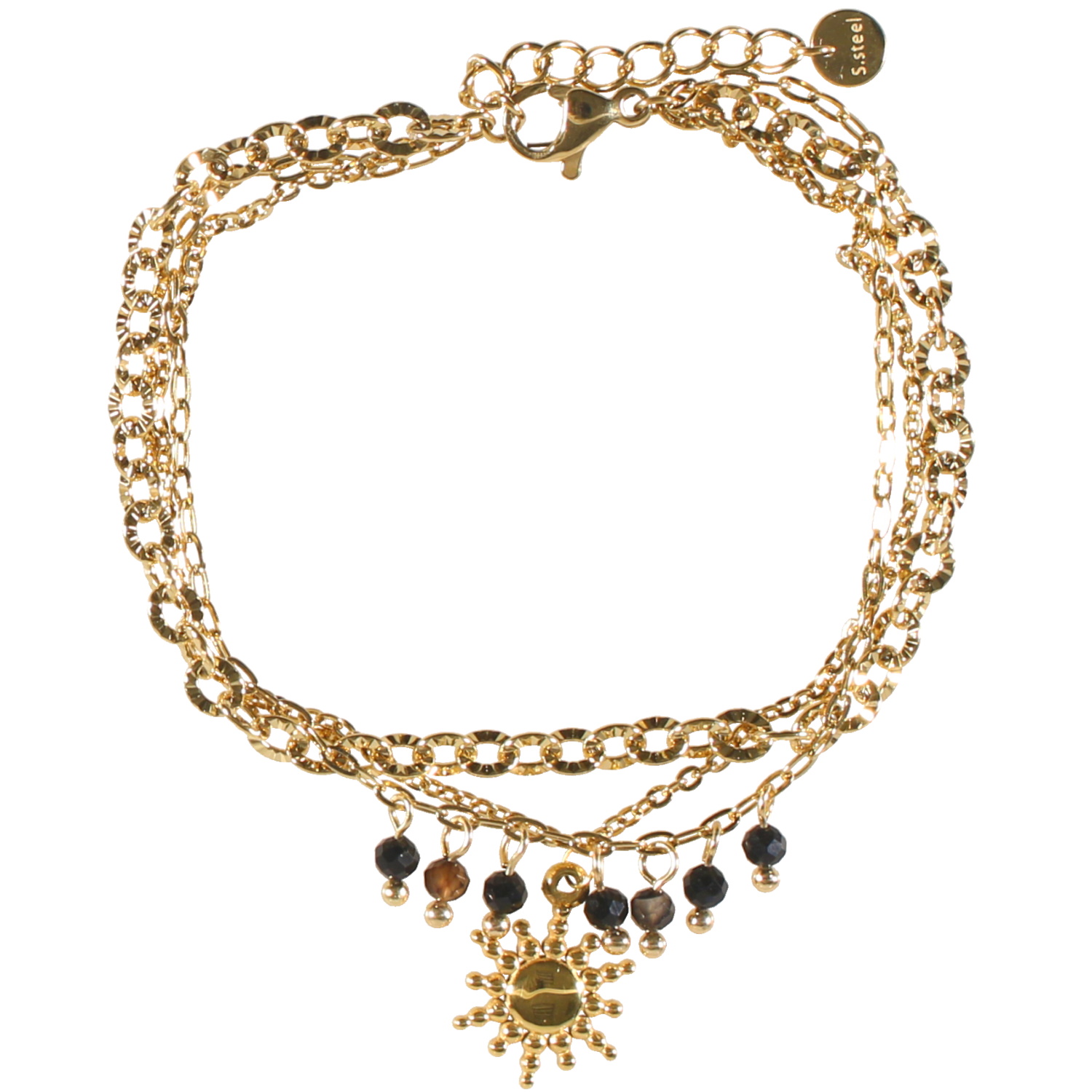 Description Bracelet triple rangs composé d'une chaîne en acier doré, une chaîne en acier doré et perles pendantes de couleur noire, ainsi qu'une chaîne avec pendentif soleil en acier doré. Fermoir mousqueton avec 3 cm de rallonge. Longueur 16+3 cm [Guide des tailles] Matière(s) Acier , Rocaille . L'acier utilisé dans la bijouterie existe sous plusieurs qualités. Nous utilisons principalement la qualité 316L, qualité qui est utilisée en chirurgie. Cet acier est donc inoxydable et reste très résistant. Fermoir Mousqueton À noter Soleil 11x13 mm Couleur(s) dominante(s) Doré , Noir Public Adolescent , Adulte . Genre Femme , Fille . Saison Indémodable . Thème(s) Nature . Cliquez sur une matière, un thème, une couleur ou une collection pour voir tous les articles associés.