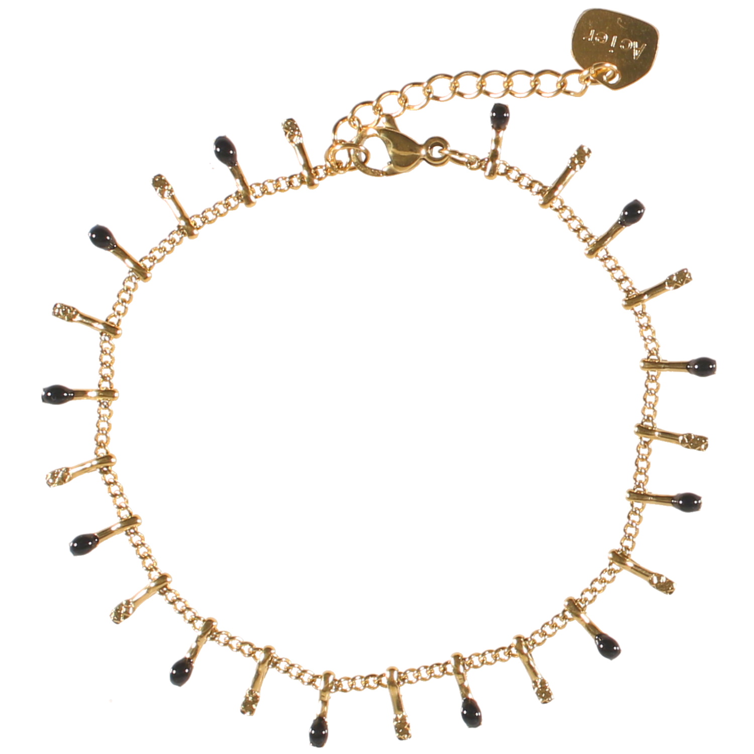 Description Bracelet composé d'une chaîne et de pampilles en acier doré et pampilles pavées d'émail de couleur noire. Fermoir mousqueton avec 3 cm de rallonge. Longueur 15.5+3 cm [Guide des tailles] Largeur 7 mm Matière(s) Acier , Email . L'acier utilisé dans la bijouterie existe sous plusieurs qualités. Nous utilisons principalement la qualité 316L, qualité qui est utilisée en chirurgie. Cet acier est donc inoxydable et reste très résistant. Fermoir Mousqueton Couleur(s) dominante(s) Doré , Noir Public Adolescent , Adulte . Genre Femme , Fille . Saison Indémodable . Cliquez sur une matière, un thème, une couleur ou une collection pour voir tous les articles associés.