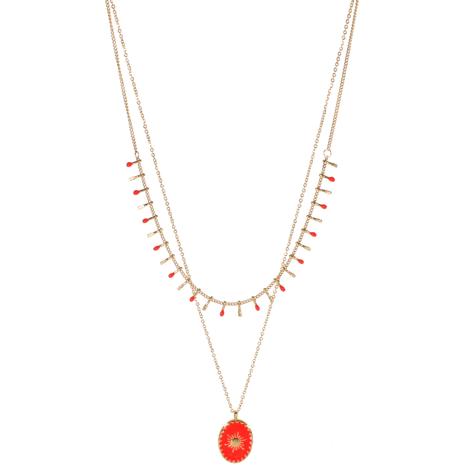 Collier double rangs composé d'une chaîne de 39 cm de long avec pampilles en acier doré et pampilles en émail, ainsi qu'une chaîne de 45 cm de long en acier doré avec un pendentif ovale au motif de soleil pavé d'émail de couleur.