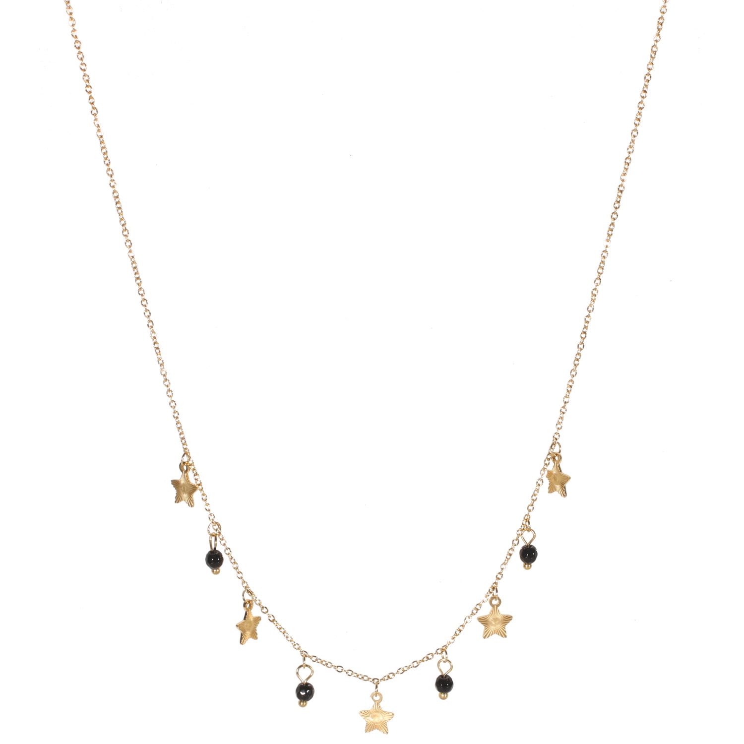 Collier composé d'une chaîne avec pampilles étoiles en acier doré et perles en véritable pierre d'agate noire.