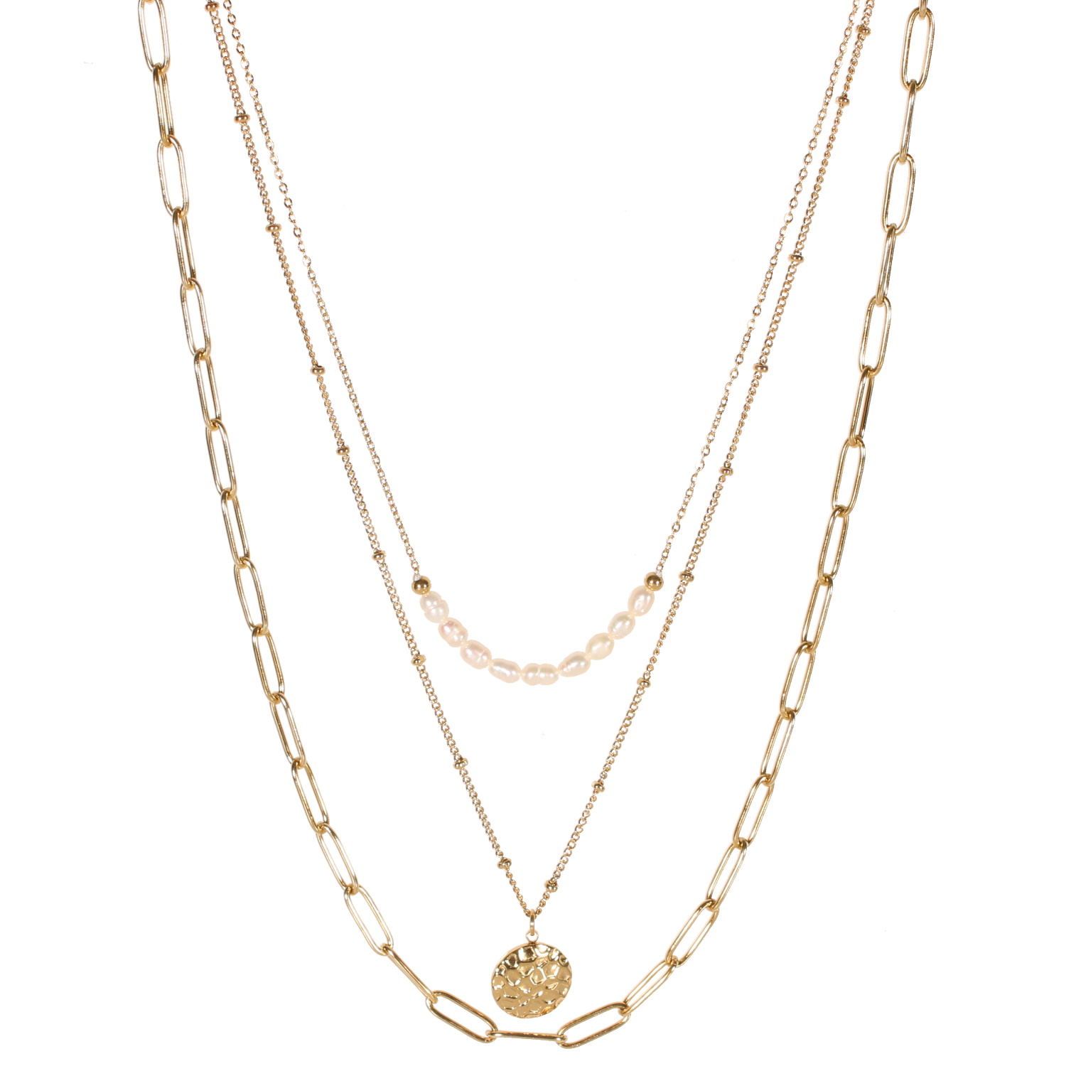 Description Collier triple rangs composé d'une chaîne de 40 cm de long en acier doré surmontée de perles de nacre, une chaîne de 44 cm de long avec pendentif rond martelé en acier doré, ainsi qu'une chaîne de 50 cm de long en acier doré. Fermoir mousqueton avec 7 cm de rallonge. Longueur 40+7 cm [Guide des tailles] Matière(s) Acier , Nacre . L'acier utilisé dans la bijouterie existe sous plusieurs qualités. Nous utilisons principalement la qualité 316L, qualité qui est utilisée en chirurgie. Cet acier est donc inoxydable et reste très résistant. Fermoir Mousqueton Couleur(s) dominante(s) Doré Public Adolescent , Adulte . Genre Femme , Fille . Saison Indémodable . Cliquez sur une matière, un thème, une couleur ou une collection pour voir tous les articles associés.