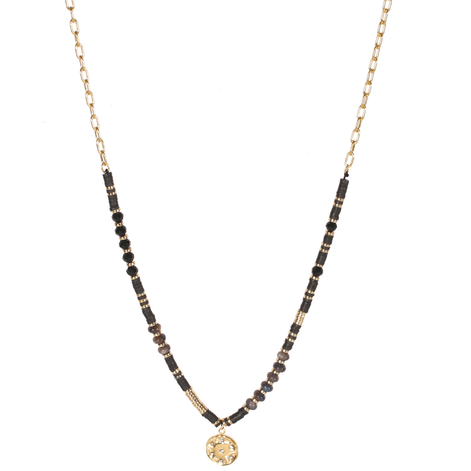 Collier composé d'une chaîne en acier doré et perles cylindriques heishi en résine synthétique et caoutchouc de couleur noire, ainsi qu'un pendentif rond en acier doré pavé de strass en forme d'étoiles.