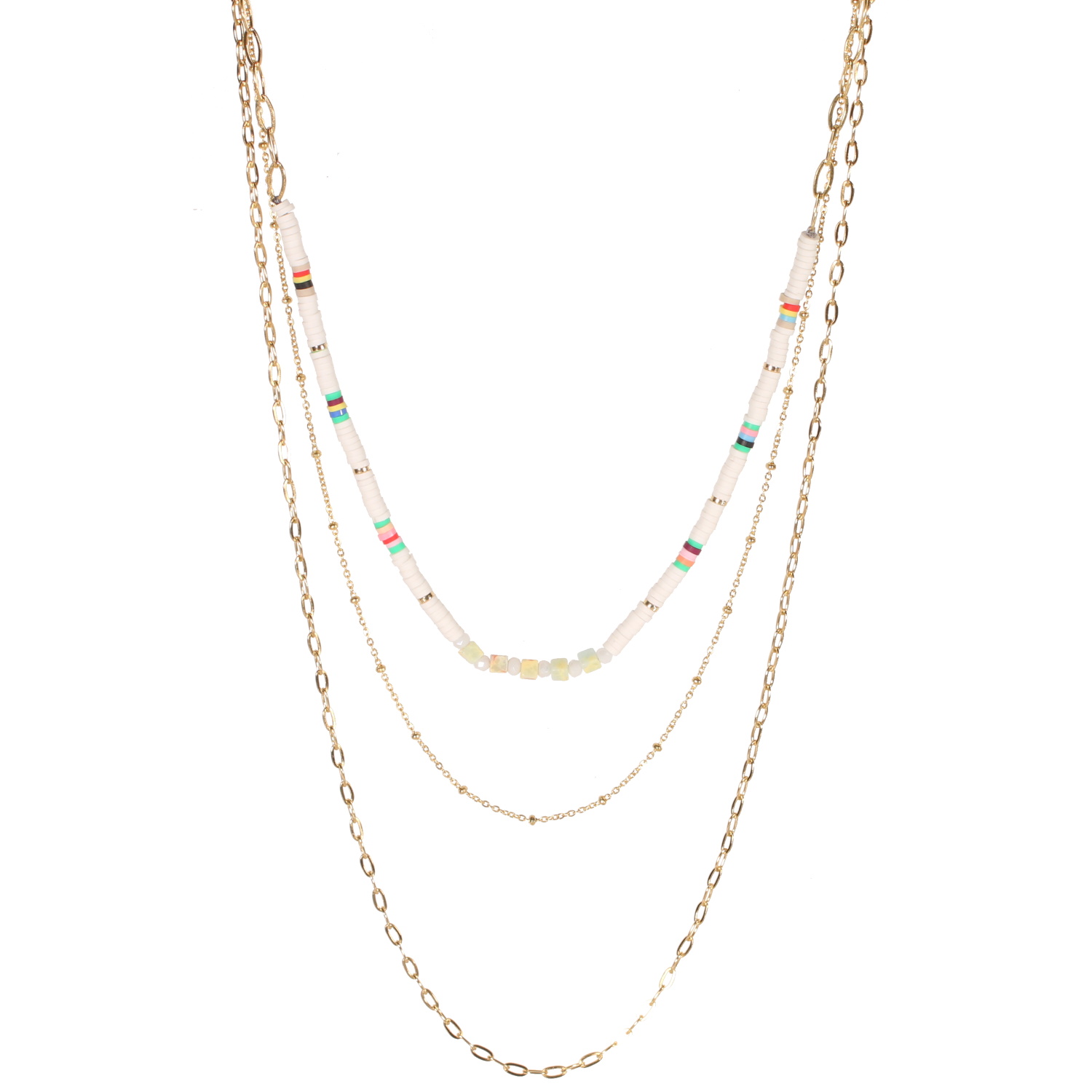 Collier triple rangs composé d'une chaîne de 38 cm de long en acier doré et perles cylindriques heishi en résine synthétique et caoutchouc de couleur blanche et multicolore, une chaîne de 45 cm de long en acier doré, ainsi qu'une chaîne de 55 cm de long en acier doré.